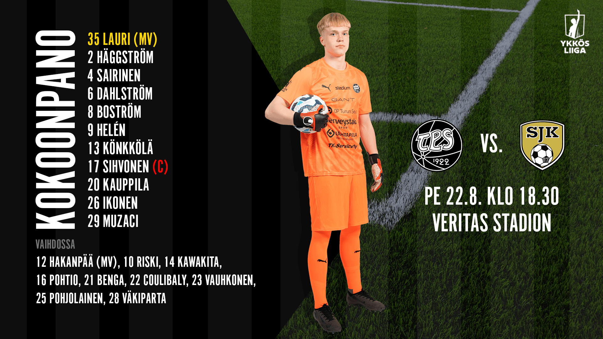 Kokoonpano Ykkösliigan otteluun TPS – SJK Akatemia pe 22.8. klo 18.30