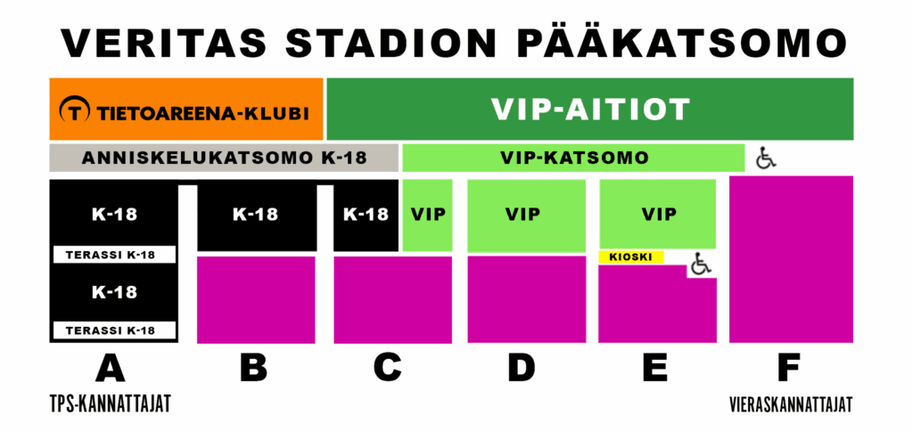 Veritas Stadionin aitioasiakkaat voivat lunastaa lipunmyynnistä lipun aitioon tai tarvittaessa tiedustella ennakkolippuja TPS:n toimistolta.