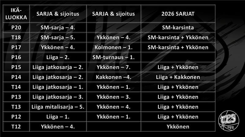 TPS:n juniorijoukkueiden kaudet ovat sarjaotteluiden osalta ohi ja on aika hetkeksi pysähtyä tarkastelemaan, miten joukkueidemme onnistuivat omissa sarjoissaan vuonna 2025. Alla olevaan taulukkoon on koottu ikäluokittain sijoitukset sarjoissa sekä niiden pohjalta ansaitut paikat ensi kauden sarjoihin. Nämä faktat ovat selkeitä ja on helppoa todeta kauden olleen monella tapaa onnistunut – listaan tähän katsaukseen kuitenkin muutaman olennaisen näkökulman kokonaisuuteen liittyen.